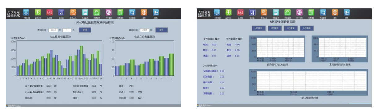 對發(fā)電量可形成月棒圖及年度棒圖顯示,并折算成二氧化碳、二氧化硫減排量值;并可查看太陽輻射強度趨勢曲線、風速變化趨勢曲線顯示